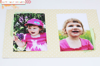 В этом развороте у нас будет использована ткань. Она наш первый обязательный элемент. Я беру пару полосочек ткани, подходящей по цветам к фото и прихватываю их при помощи Glossy. У меня желтая и зеленая ткань, это будет продолжение поля на фото.