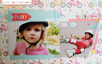Вторая страница спокойнее, хочу уравновесить яркую велосипедную. Поддерживаю фон фотографии с помощью кусочков бумаги.
